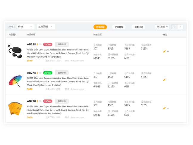 Provides comprehensive product sales data (average daily sales, 7-day/30-day sales, visits, conversion rate), as well as advertising data and cost profit data.